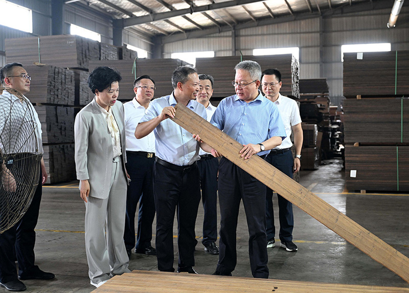 2025年6月16日,省政協(xié)副主席虢正貴來湖南桃花江竹材科技股份有限公司調(diào)研生態(tài)資源轉(zhuǎn)化與特色產(chǎn)業(yè)融合發(fā)展。公司董事長(zhǎng)、省人大代表薛志成陪同并介紹情況。虢正貴充分肯定了桃花江竹材在竹資源利用及竹特色產(chǎn)業(yè)融合發(fā)展所取得的成果,他鼓勵(lì)企業(yè)繼續(xù)發(fā)揮龍頭優(yōu)勢(shì),充分利用好桃江資源稟賦和產(chǎn)業(yè)優(yōu)勢(shì),深化產(chǎn)學(xué)研融合,提升竹產(chǎn)業(yè)附加值,為民族地區(qū)生態(tài)資源高效轉(zhuǎn)化和特色產(chǎn)業(yè)融合發(fā)展探索更多經(jīng)驗(yàn)。
